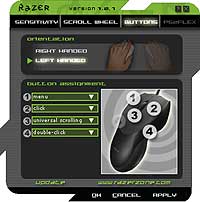 The Boomslang is not only symmetrical, but its driver software makes specific allowance for left-handed users. As well as deactivating the side button that can't be pressed, swapping the mouse's handedness also swaps the functions of the left and right buttons. This may or may not be what you want to happen - many lefties are, of necessity, used to using the same left and right button functions as right-handers - but it's easy enough to swap the buttons back again.
