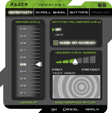 The on-the-fly sensitivity adjustment feature lets you hold down the thumb button and roll the mouse wheel to set the Boomslang's sensitivity, with a simple on-screen display to show the setting. The display flickers oddly if you call it up while playing some games, but it always seems to work.