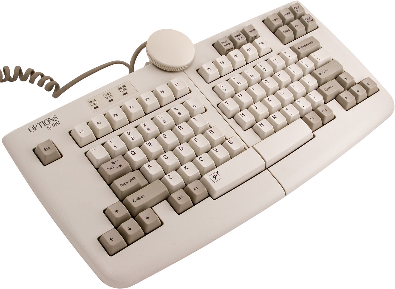 This is, for the benefit of less perceptive readers, an ergonomic split keyboard. It's got lower profile keys than a Model M and it's got an ominously... stylish... "OPTIONS by IBM" logo printed on it, not to mention some squiggly thing printed on the space bar. So the obvious conclusion is that this is, as far as its keys go, one of the entirely unremarkable rubber dome 'boards that IBM/Lexmark/whoever have been churning out by the zillion since the buckling spring left the mainstream.