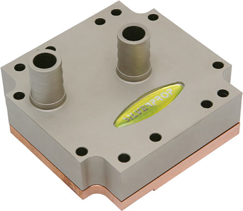 Australian extreme cooling and radio controlled aircraft (seriously!) outfit Silverprop continue their locally-made-stuff-that-looks-like-exotic-gear-from-Japan product line with the Cyclone water blocks. This one, the Cyclone, is made for Socket A motherboards with mounting holes, contains a sinuous turbulence-encouraging water path, and has heavy-and-serious all-metal construction. It's a bit taller, and a bit weightier, than Danger Den's similar sized blocks. That black top U-piece is anodised, not plastic.
