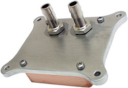 The P4-CX2 is a well engineered piece of kit, with a substantial square copper base under an aluminium lid with mounting tabs on the corners. The hose barbs are 3/8th inch.