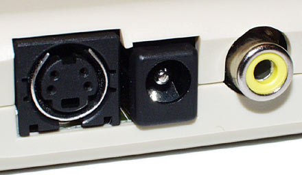 DC input socket in the middle, composite output RCA connector to the right, Y/C mini-DIN connector to the left. You can use the composite and Y/C outputs simultaneously, but you don't get separate picture settings for the two of them.