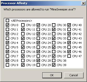 Note that Hyper-Threading turns each physical CPU core into two virtual CPUs. "CPUs" 0 and 1 are both on the first physical core, CPUs 2 and 3 are the next one, and so on. If you set a multithreaded process's affinity to "CPUs" 2 and 3, it may run faster than it would on only one "CPU", but to get the full benefit you need to spread the process across more than one physical core, by telling it to use CPUs 2 and 4, for instance.