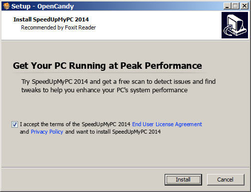 Here's SpeedUpMyPC again, this time trying to sneak in via the installer for Foxit Reader, a perfectly good PDF viewer.