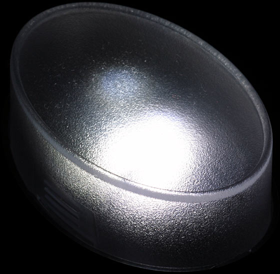 The LEDs are standard 5mm high intensity units. There's one white LED on each side (they're the ones with the yellow phosphor blob; the front-right LED in this picture is the phosphor-less red one), so you can bend them outwards each way if you want a wider light pattern.