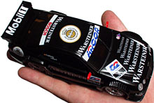 When I first wrote this review, my sponsors Aus PC Market were selling Mini-Zs for $AU278.30, delivered within Australia. They're not any more, but that's still a pretty representative price for this boxed version; you get the car, the pre-decorated body, and the radio gear. All you need to add are eight AA cells for the transmitter (alkaline or rechargeable) and four AAA cells for the car (rechargeable, by preference, but alkalines will do in a pinch), and a charger to suit if you're using rechargeables, and you're away. The cars are very nearly ready to run right out of their natty little display box.