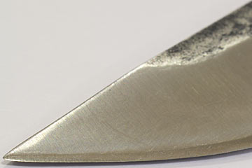 The HUGE HUNTING Miyabi 613 ET CETERA also lacks the traditional "kissaki" tip of a classic katana-pattern blade, with its clear and distinctive "yokote" line where the relatively thick blade starts to taper to the thin, stabby point. This knife's tip actually tapers a bit unevenly on the two sides (another sign that this is a cheap knife), with the edge bevel staying the same width right to the tip. The tip is thus a slightly off-centre point, not quite as skinny and stab-tacular as a kissaki.