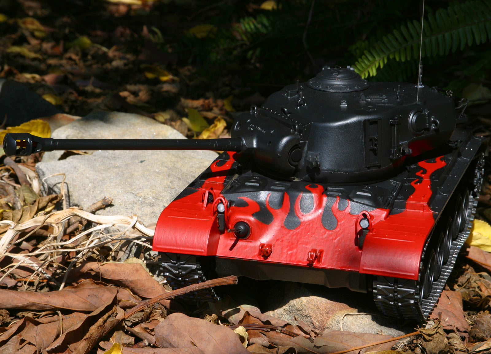 ...and then there are 1/16th scale radio controlled tanks with motorised turret, engine and gun sound effects, light-up main and machine guns, working headlights and tail lights, and realistic main gun recoil. Full suspension, fully articulated tracks, lots of scale detail, respectable speed...