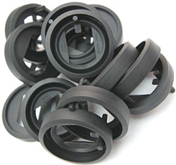 These are some of the Pershing's road-wheel tyres. They're rubber, there are 28 of them, and each one contains moulding flashing on the inside, which you have to pull out (it all ripped out cleanly, for me). Two tyres, and six other parts, go into each of the 14 wheel assemblies...
