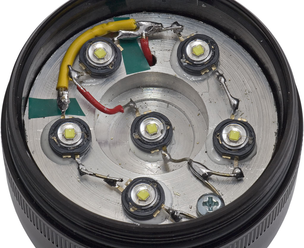 Six, count 'em, six, Luxeon III LEDs. The minimalist "Emitter" type, to be precise, not the "Star" type that comes mounted on a hexagonal circuit board.