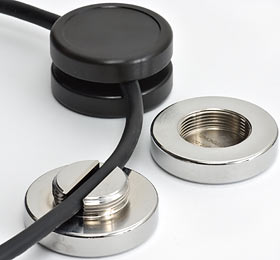 They're WireWeights - heavy two-part cable-clampy things that screw onto the wire of your choice, and act as a paperweight for a cable. I got one black zinc finish and one bright chrome finish WireWeight for review; they make a matte-silver nickel plated one as well.